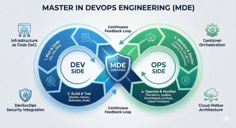 The Master in DevOps Engineering (MDE) is a globally recognized certification program aimed at providing professionals with an advanced understanding of the complete DevOps lifecycle, from planning and coding to deployment and monitoring. This program is perfect for engineers and managers who want to enhance their DevOps skills, improve collaboration between development and operations teams, and implement automation to optimize workflows.